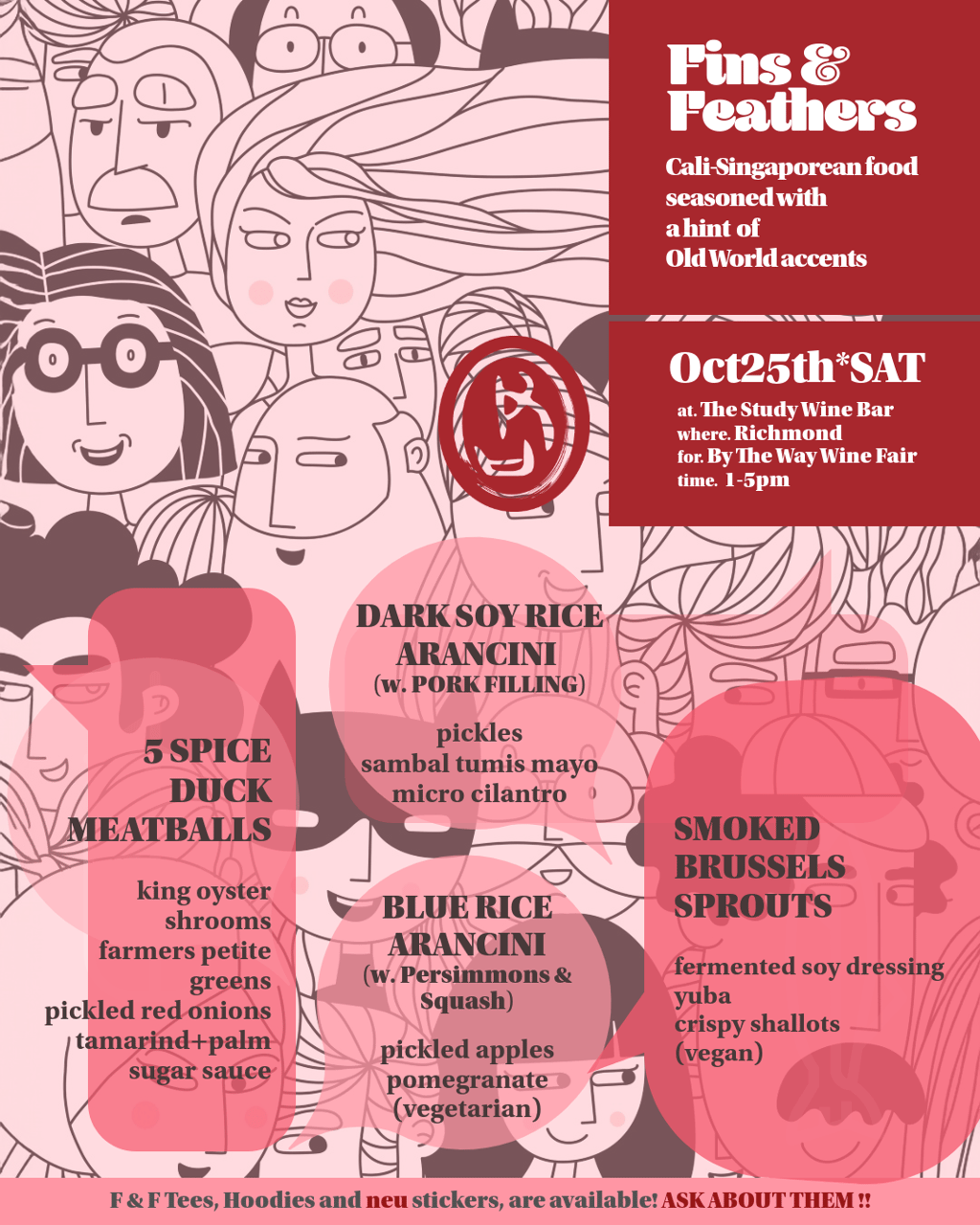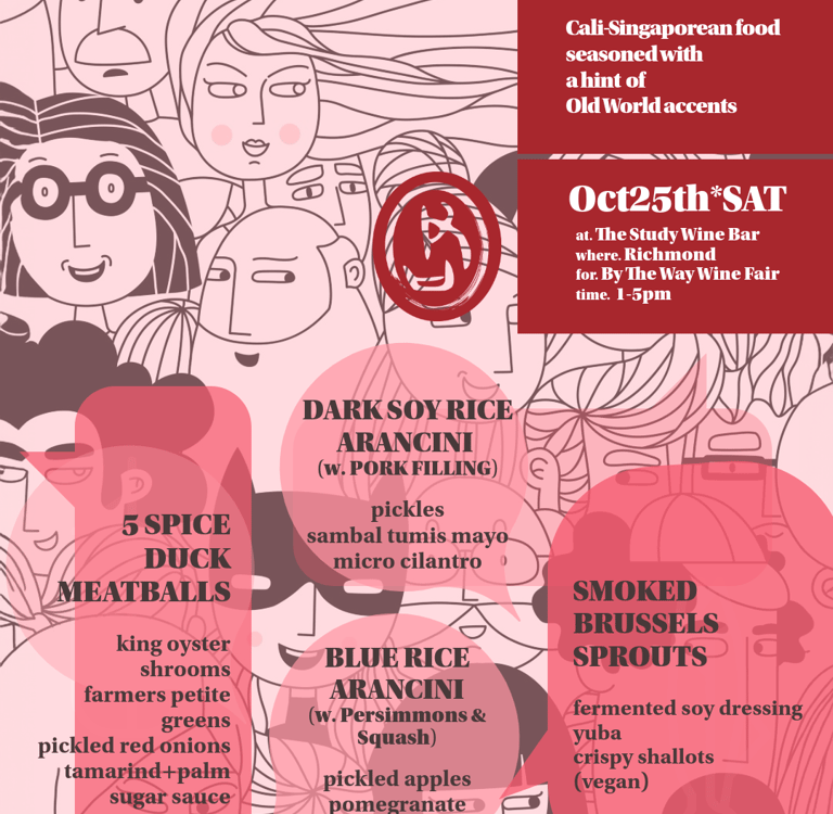 By The Way Wine Fare. That morning started out chilly and drizzly when we heading out to The Study Winebar in Richmond. Crowd came trickling in as soon as the precipitation receded. Fellow friends, Lunar SF, Milk Bread Bakery, Pops Creole, who were also popping up there definitely felt the love from the community. Yep all felt the ravenous appetite from the crowd. As for Fins and Feathers, we had put out countless orders of duck meatballs and arancinis! There were also mini brussels sprouts on the menu. They came from Zarate Family Farm (ZFF). Take a peek at some of the fall produce grown at ZFF in a recent trip there! More than 20 local (Californian) wine makers came with their magic pours and of course being swamped means we were only able to 'party' after the party. We postponed our own uncorking until our mission for the day was completed. We appreciate all the new friendships and support with an abundance of gratitude. Cheers!