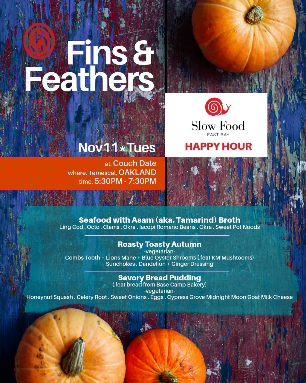 Slow Food East Bay had offered a chance to showcase some Fins & Feathers flavors for their November's happy hour at Couch Date (Temescal). The room was filled with the warmth of a chill crowd with good vibes. Records were spinning, libations pouring, comfort food to keep bellies of the community happy. We were moved by the support for small businesses like ours. It carried good intentions and moved us forward with renewed purpose and motivation. Peeps enjoyed the seafood tomato-tamarind (aka asam) stew and welcomed the savory bread pudding with zest. Both are definitely keepers on the menu, especially during colder seasons.