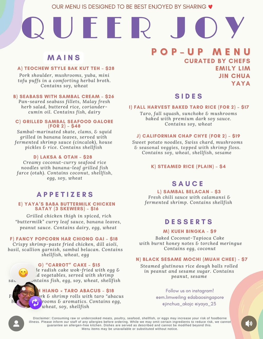 Queer Joy popup with two other Singaporean queer chefs, Emily Lim and Iyaya! We had brought popular dishes from home and also those that were inspired by flavors from Singapore to the event! It was quite a turnout from both queer and alliance communities! They came with ravenous appetites. The kitchen was action packed with the sound of pots and pans knocking, grill sizzling, soups boiling. It was filled with the aromas of the food we would get back at home. We definitely cooked our hearts out to show our appreciation!