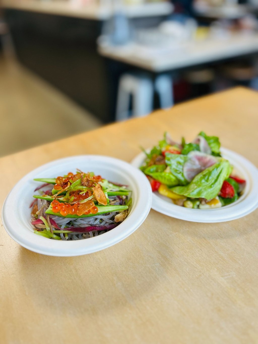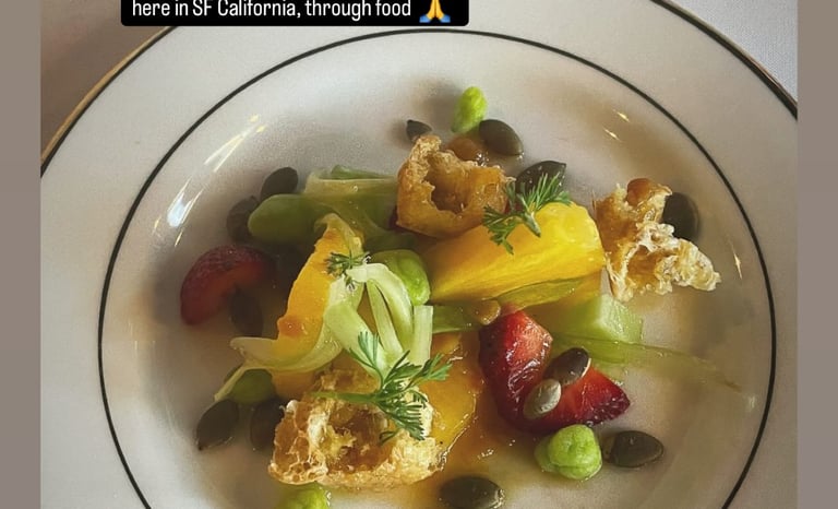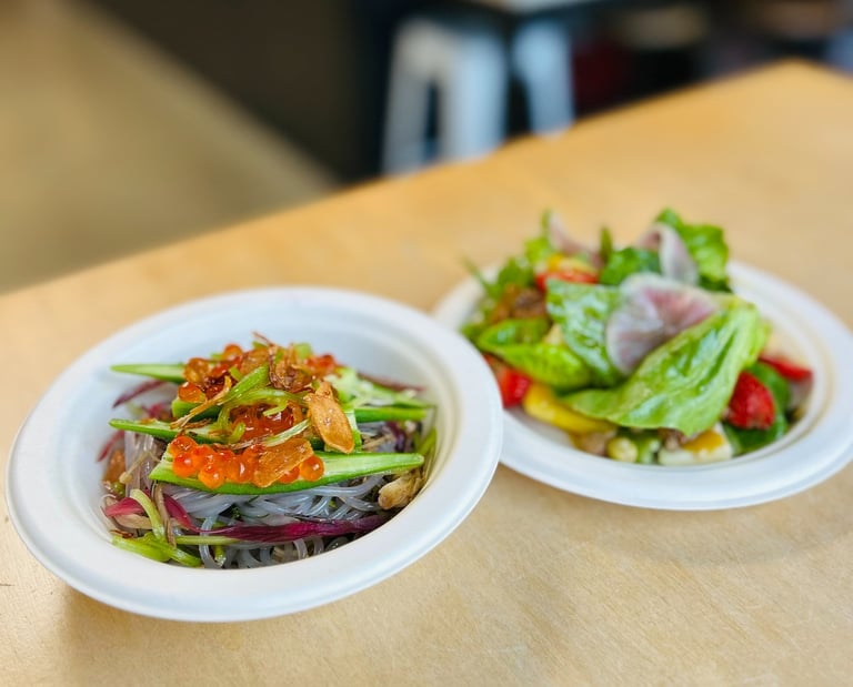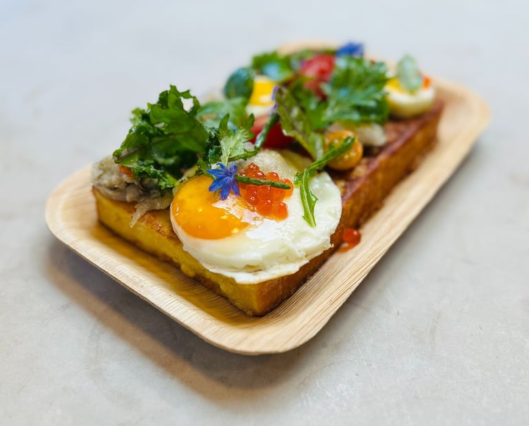 Talk about reinterpreting a Singaporean dish with a Californian twist! The marriage of a Singaporean style oyster omelette and French toast resulting in a small garden of dressed farmers petite green atop a french toast featuring milk bread from Milk Cloud Bakery. Hidden in the salad, are lightly fried kumamoto oysters (from Monterey Fish Market) with sunny quail and regular eggs, finished with ikura. You will have to agree that this is a luxurious French toast!