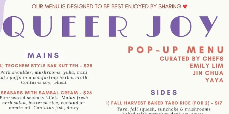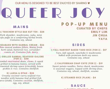 Queer Joy popup with two other Singaporean queer chefs, Emily Lim and Iyaya! We had brought popular dishes from home and also those that were inspired by flavors from Singapore to the event! It was quite a turnout from both queer and alliance communities! They came with ravenous appetites. The kitchen was action packed with the sound of pots and pans knocking, grill sizzling, soups boiling. It was filled with the aromas of the food we would get back at home. We definitely cooked our hearts out to show our appreciation!