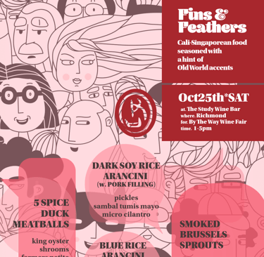 By The Way Wine Fare. That morning started out chilly and drizzly when we heading out to The Study Winebar in Richmond. Crowd came trickling in as soon as the precipitation receded. Fellow friends, Lunar SF, Milk Bread Bakery, Pops Creole, who were also popping up there definitely felt the love from the community. Yep all felt the ravenous appetite from the crowd. As for Fins and Feathers, we had put out countless orders of duck meatballs and arancinis! There were also mini brussels sprouts on the menu. They came from Zarate Family Farm (ZFF). Take a peek at some of the fall produce grown at ZFF in a recent trip there! More than 20 local (Californian) wine makers came with their magic pours and of course being swamped means we were only able to 'party' after the party. We postponed our own uncorking until our mission for the day was completed. We appreciate all the new friendships and support with an abundance of gratitude. Cheers!