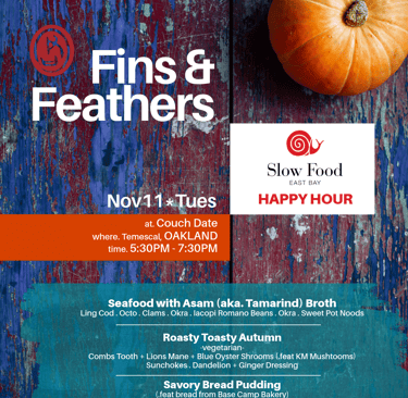 Slow Food East Bay had offered a chance to showcase some Fins & Feathers flavors for their November's happy hour at Couch Date (Temescal). The room was filled with the warmth of a chill crowd with good vibes. Records were spinning, libations pouring, comfort food to keep bellies of the community happy. We were moved by the support for small businesses like ours. It carried good intentions and moved us forward with renewed purpose and motivation. Peeps enjoyed the seafood tomato-tamarind (aka asam) stew and welcomed the savory bread pudding with zest. Both are definitely keepers on the menu, especially during colder seasons.